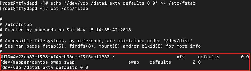 # echo ‘/dev/vdb /data1 ext4 defaults 0 0’ >> /etc/fstab (自动挂载命令,会出现确认命令,选择y)