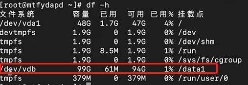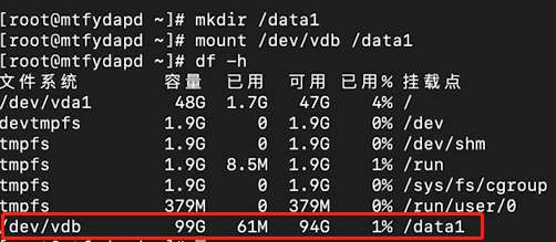 # mount /dev/vdb /data1 (将硬盘vdb挂到目录data1下)
