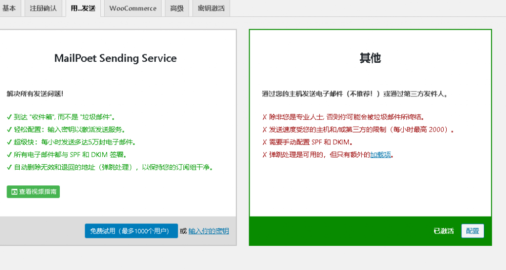 3、用什么发送,这里有mailpoet的官方发送,需要到官方注册个账号,然后把激活密匙填上就可以了,当然1000个用户是免费的,后边就需要费用了,这里我选择了其他,我用第三方发件人。