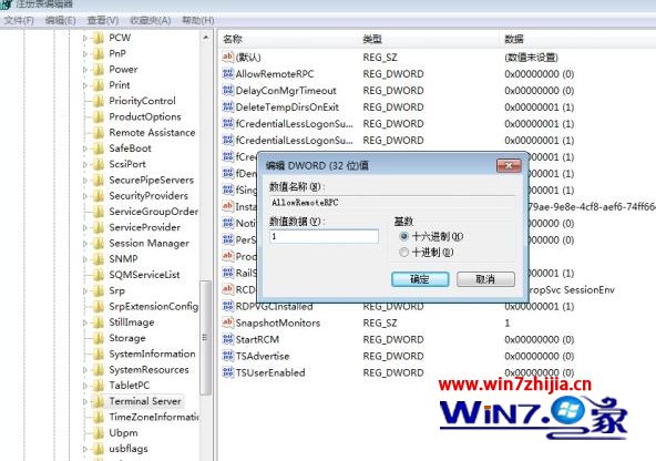 1、这里假设我们发送消息的电脑为A,接收消息的电脑为B,首先在B电脑上进行操作,启动注册表编辑器,定位到[HKEY_LOCAL_MACHINE\SYSTEM\CurrentControlSet\Control\Terminal Server],将右侧的“AllowRemoteRPC”的值更改为“1”