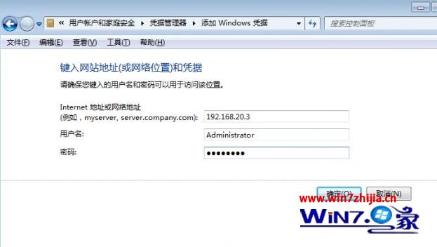 2、现在回到A电脑上,打开它的控制面板,依次展开“控制面板→用户帐户和家庭安全→凭据管理器”,点击“添加Windows凭据”,在打开的窗口中按提示依次填入B电脑的局域网IP地址、登录B电脑的用户名和登录密码(图2)。