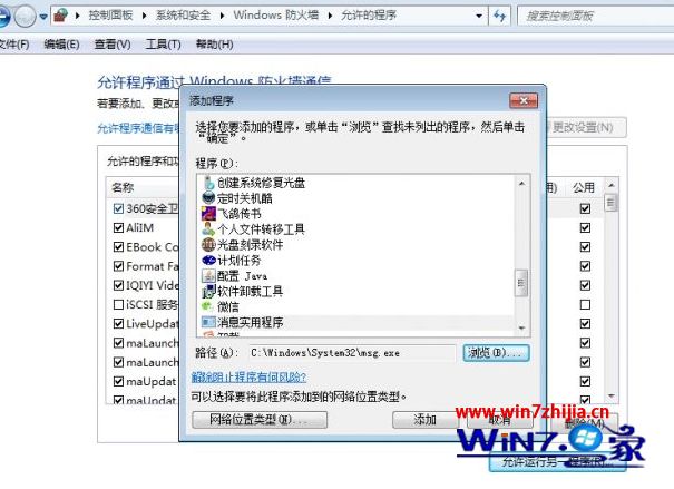 在A、B两台电脑上都打开控制面板,依次展开“控制面板→系统和安全→Windows 防火墙→允许的程序”,点击“允许运行另一程序”,然后将“C:\Windows\System32\Msg.exe”添加到允许列表中(图3),设置完毕将两台电脑重启。