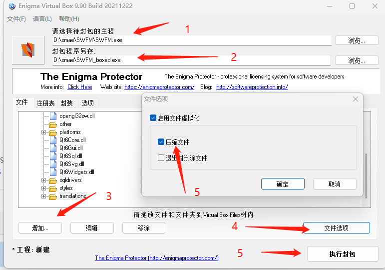 qt发布程序后会有一堆dll库文件,如果想变成单个绿色的可执行文件就需要吧dll和exe打包到一起,我用Enigma Virtual Box。