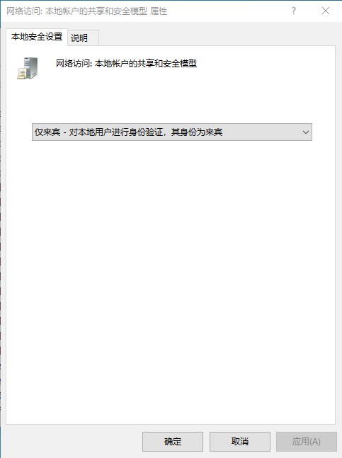 2、在刚刚的页面找到网络访问:本地账户的共享和安全模型,双击更改为仅来宾-对本地用户进行身份验证,其身份为来宾,点击确定。